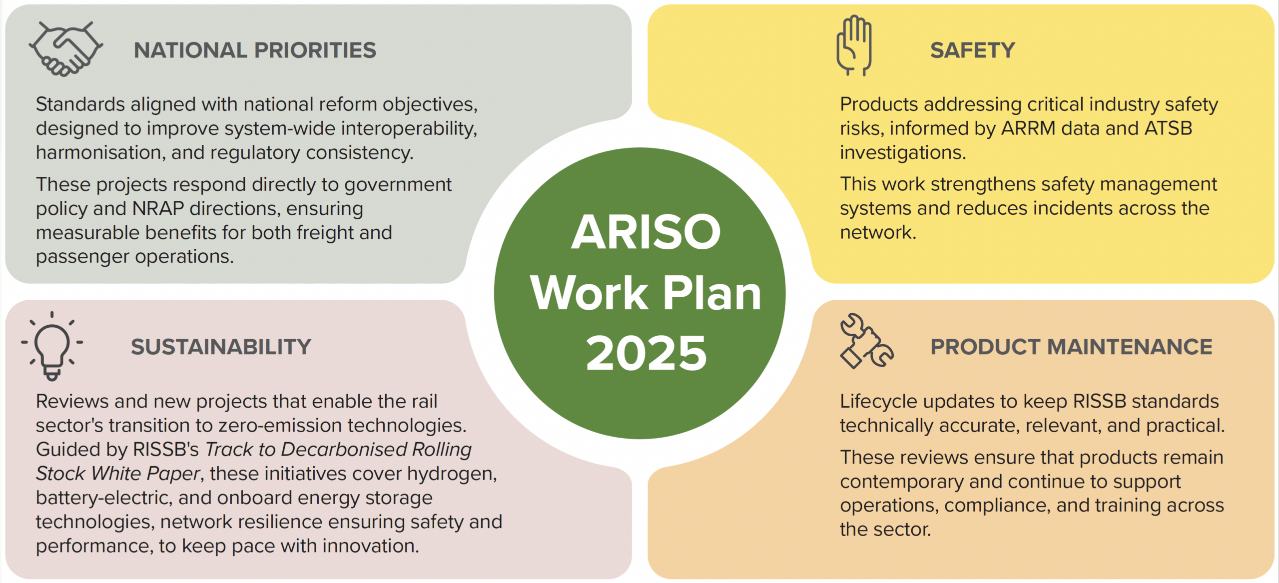 While they may not directly address national reforms or critical safety risks, these maintenance reviews are vital so rail organisations can rely on ARISO products for effective operations, compliance and training. They respond to feedback, change requests, new practices and shifts in related standards and regulations, improving overall quality, consistency and usability across the library.